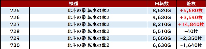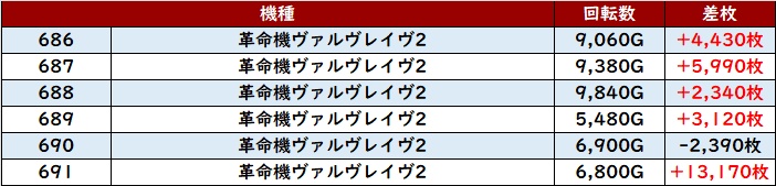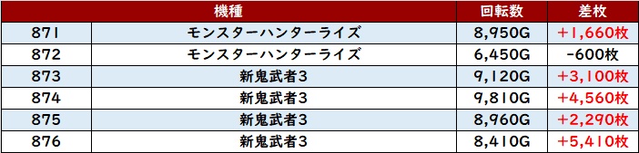 全台回転数9,100G以上に加えて、6台中5台が差枚数+2,900枚超えと素晴らしい結果を見せつけ、熱気に溢れていた!