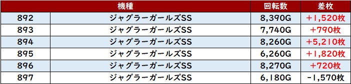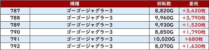 他にも「ゴージャグ3 787~792」が全台プラス差枚と絶好調!