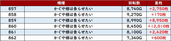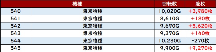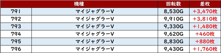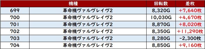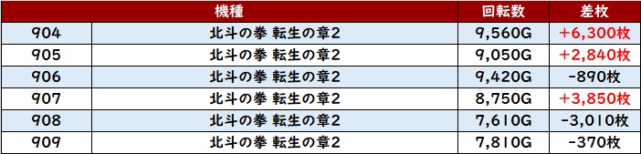 全台回転数7,500G超えに加え、6台中4台が差枚数+3,900枚超えと大満足の結果を残していた。