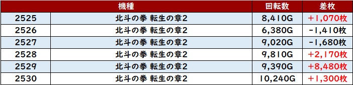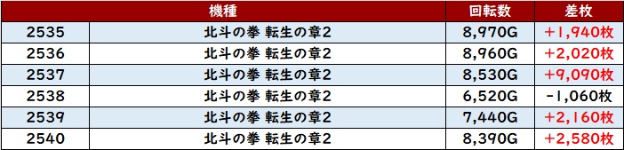 まずは「北斗転生2 2525~2530、2535~2540」が2箇所にわたって大盛り上がり!