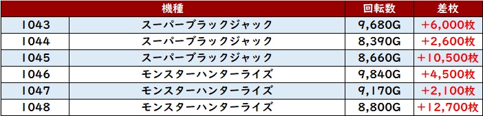 まずは「スーパーブラックジャック~モンハンライズ 1043~1048」が機種跨ぎで大盛り上がりに!