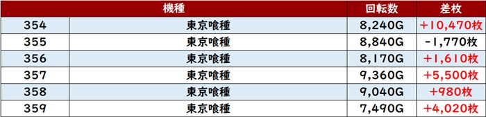 まずは「東京喰種 354~359」の大半が回転数8,100G超えと、驚愕の稼働率を誇る!