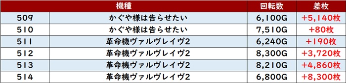 続いて「かぐや様~ヴヴヴ2 509~514」機種跨ぎで好調さをアピール!