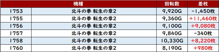 まずは「北斗転生2 1753~1760」が殆どが回転数9,100G以上の圧巻の稼働状況に!