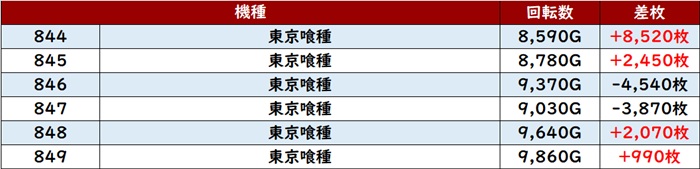 まずは「東京喰種 844~849」全台回転数8,500G超えと高稼働に!