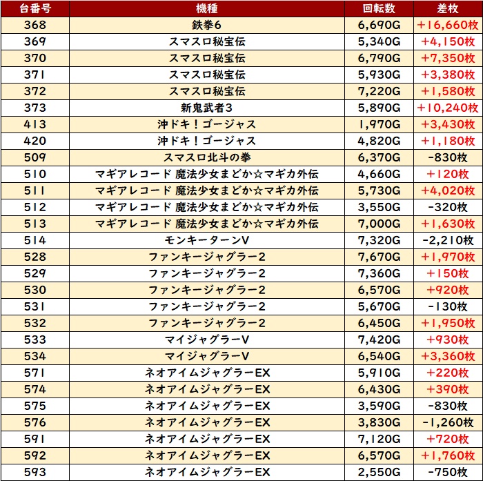 ・集計機種計28台総差枚数:+59,800枚