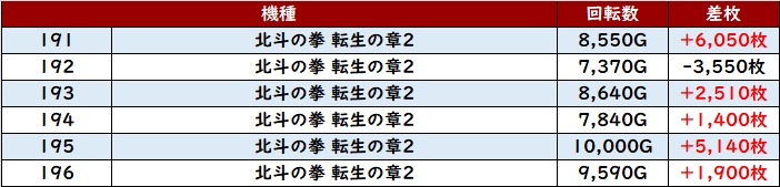 まずは「北斗転生2 191~196」回転数7,300G超えと、粘り腰のユーザー多数!