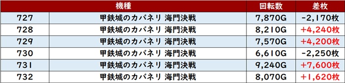まずは「カバネリ海門決戦 727~732」の殆どが回転数7,500G超えと朝の勢いそのままに絶好調!