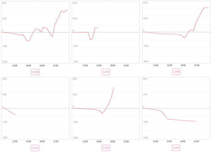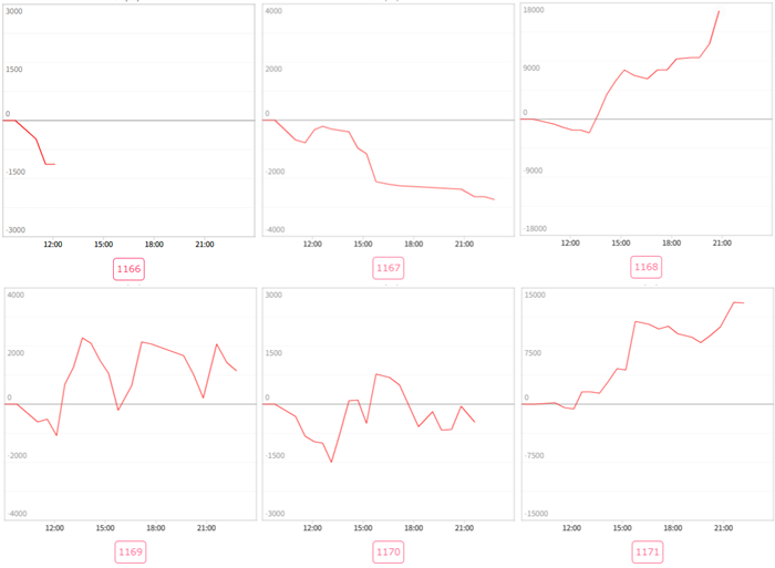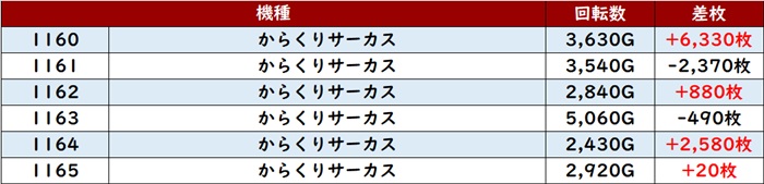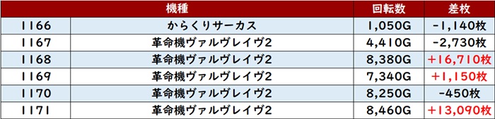 続いて「からくりサーカス~ヴヴヴ2 1166~1171」からも差枚数+1.3万枚超えの台を複数目撃!