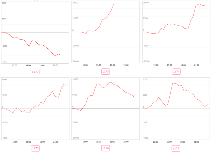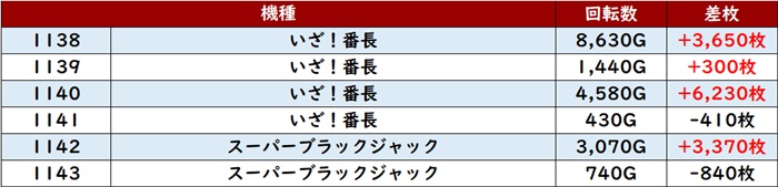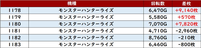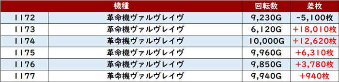 まずは「ヴヴヴ 1172~1177」が6台中5台が回転数9,200G超え&プラス差枚と絶好調!
