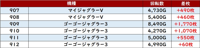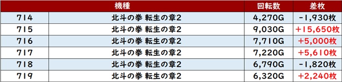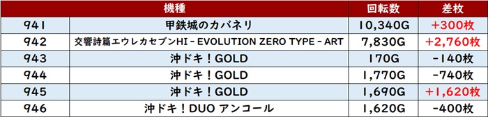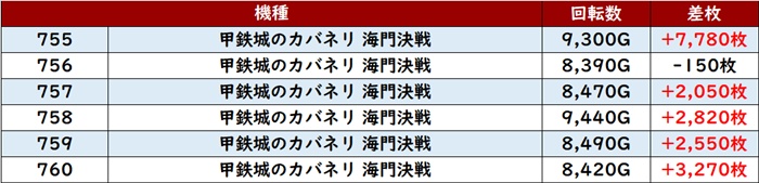 まずは「カバネリ海門決戦 755~760」6台中5台が差枚数+2,000枚超えと絶好調!