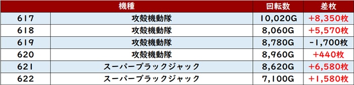 更に「攻殻機動隊~スーパーブラックジャック 617~622」回転数1万G超えが見られる程の高稼働に!