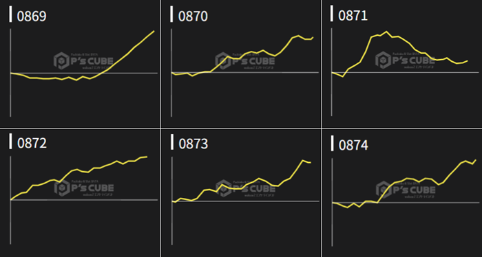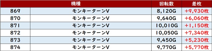 まずは「モンキー5 869~874」回転数8,100G超えと朝の勢いそのままに凄まじい稼働状況に!