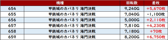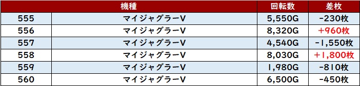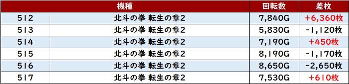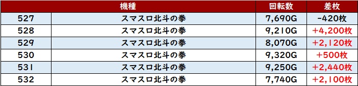 続いて「スマスロ北斗 527~532」が全台回転数7,600G超え、6台中5台がプラス差枚と優秀な結果に!
