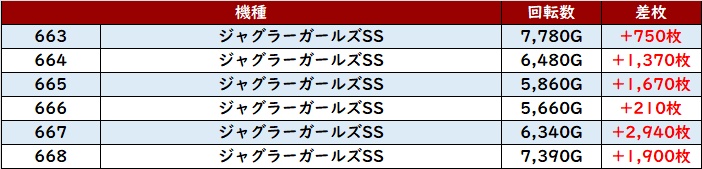まずは「ガールズSS 663~668」が全台プラス差枚に!