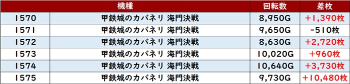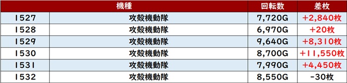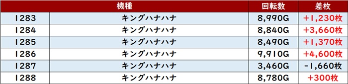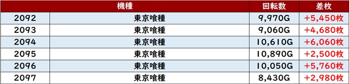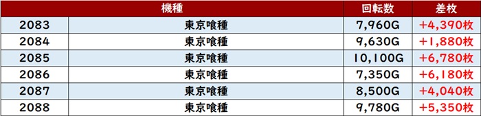 まずは「東京喰種 2083~2088、2092~2097」の計12台が全台大幅プラス差枚を記録!