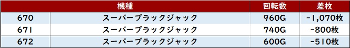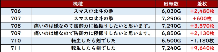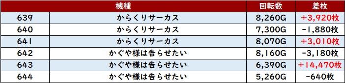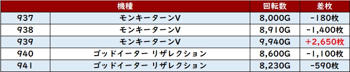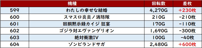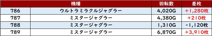 半数以上が回転数7,600G超えの稼働となっており、更に6台中5台がプラス差枚と非の打ち所がない結果を記録していた!