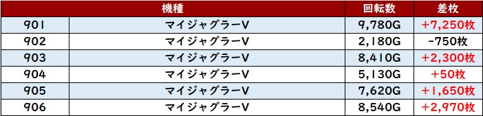 まずは「マイジャグ5 901~906」から差枚数+7,250枚とインパクトのある出玉感を確認!