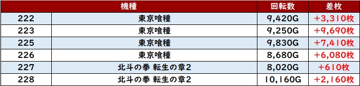 まずは「東京喰種~北斗転生2 222~228」が全台プラス差枚と文句無しの結果に!