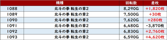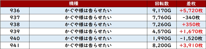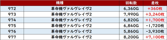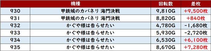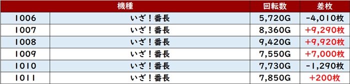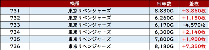 6台中5台が大幅プラス差枚且つ中には差枚数+7,350枚の台も確認でき、終日大賑わいとなった。