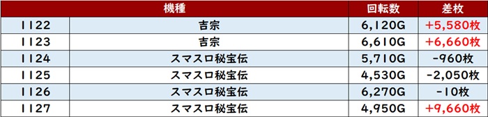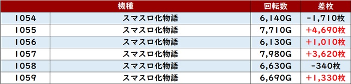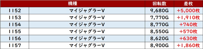まずは「マイジャグ5 1152~1157」全台プラス差枚と優秀な数値を記録!