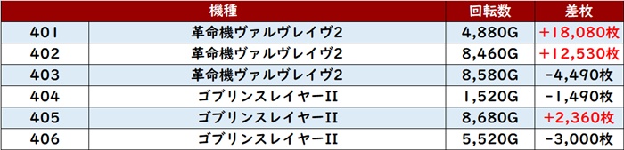 続いて「ヴヴヴ2~ゴブスレ2 401~406」から驚異的な出玉感を叩き出す台を目撃!