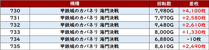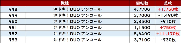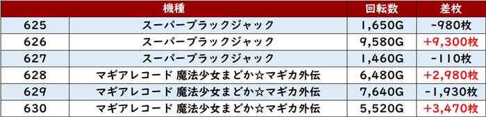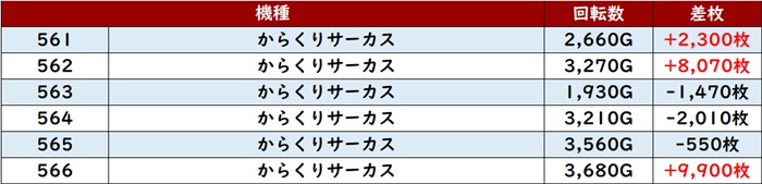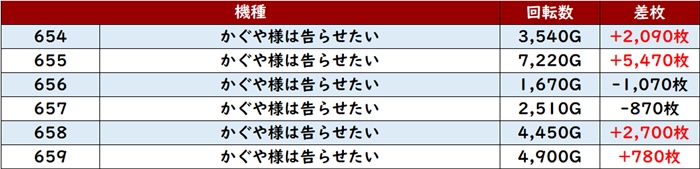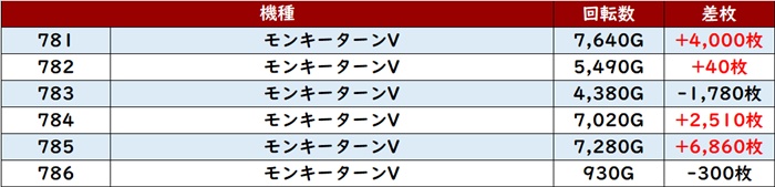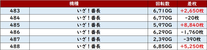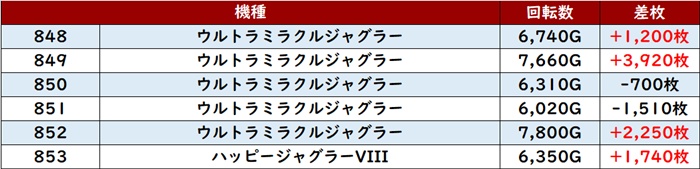 差枚数+12,080枚を筆頭に大半が差枚数+4,300枚超えと素晴らしい結果を残し、店内の盛り上がりを後押しした。