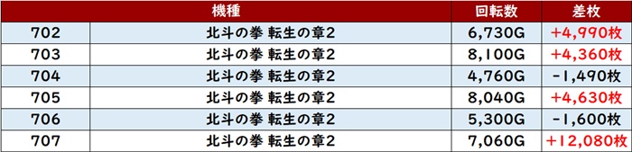まずは「北斗転生2 702~707」が目を見張る出玉感に!