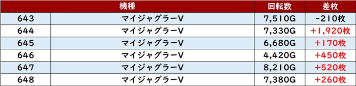 続いて「マイジャグ5 643~648」が殆どがプラス差枚と大健闘!