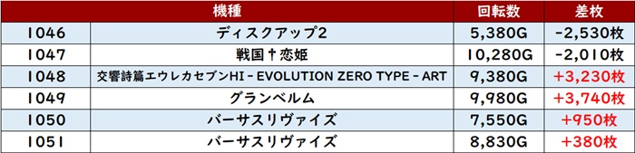 まずは「ディスク2~バーサスリヴァイズ 1046~1051」から差枚数+3,200枚超えを複数目撃!