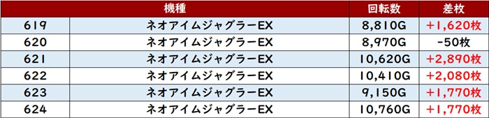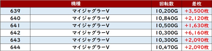 まずは「マイジャグ5 639~644」が全台大幅プラス差枚と非の打ち所がない結果に!