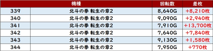 続いて「北斗転生2 339~344」差枚数+13,700枚を含んで盛況に!
