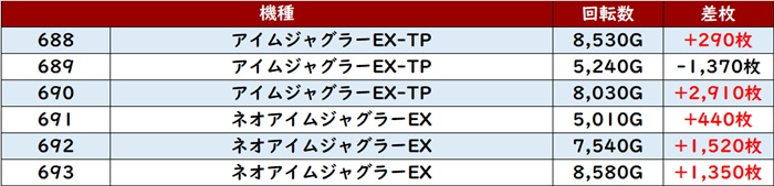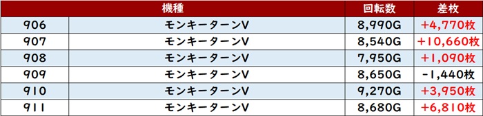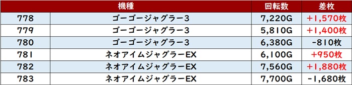 全台プラス差枚となり、その内半数が差枚数+7,800枚超えと賑わっていた。