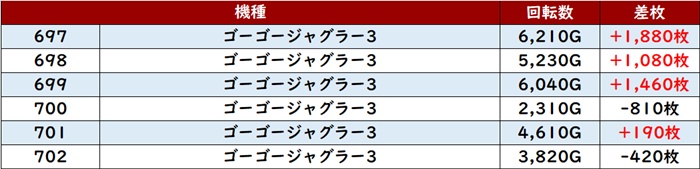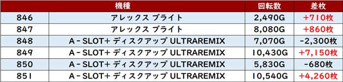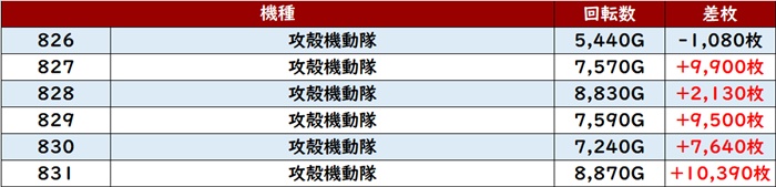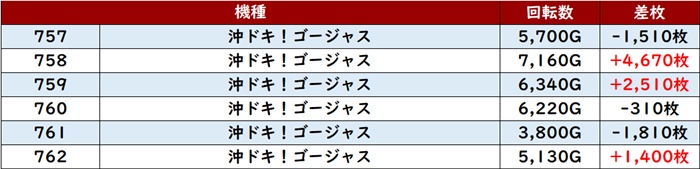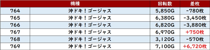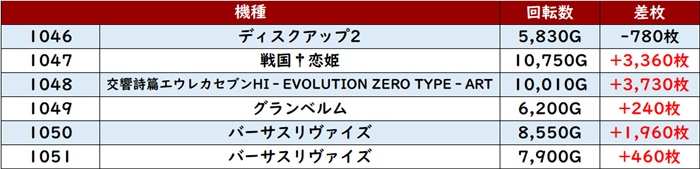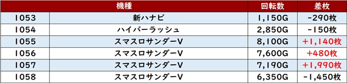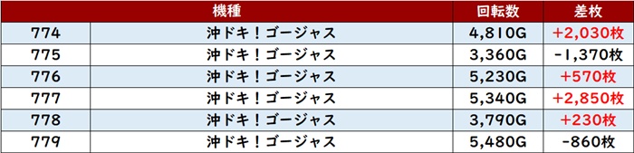 回転数1万G超え&差枚数+4,200枚超えの台が複数見受けられ、状況の良さは間違いなさそうであった。
