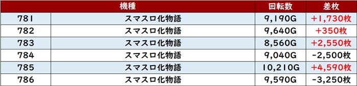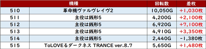 続いて「ヴヴヴ2~ToLOVEるトランス 510~515」が機種跨ぎで好調となり、半数以上がプラス差枚と盛り上がりを牽引!