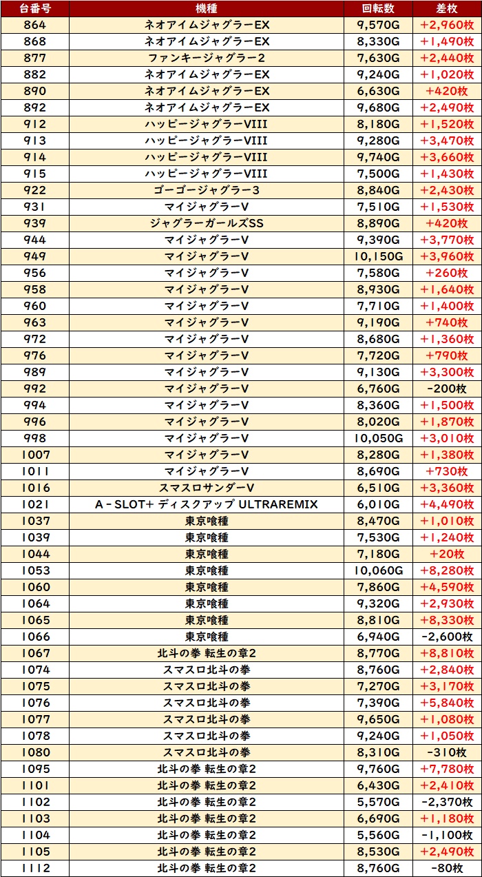 機種の荒い部分が出てしまい、くすぶってしまう台も少なくなかったが、中にはポテンシャルの高さを引き出し差枚数+10,230枚と大台を突破した台も確認できた!