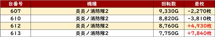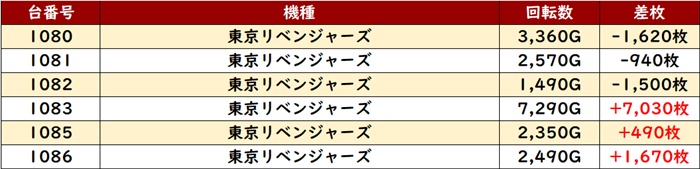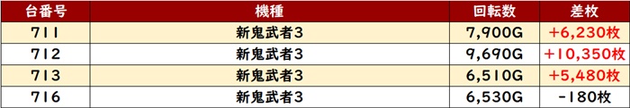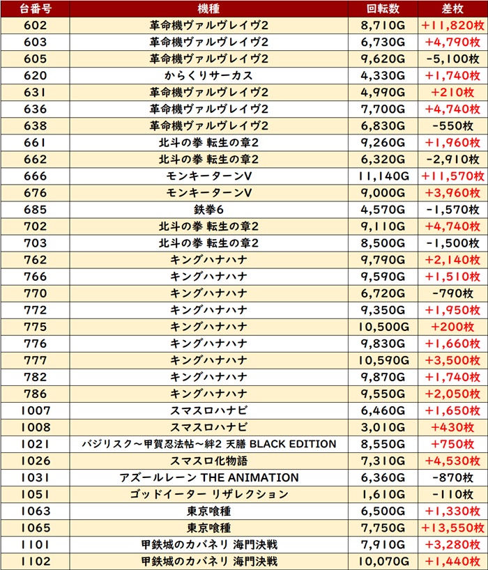 差枚数+7,030枚と驚愕の出玉感を記録する台が見受けられ、稼働次第ではその他の台もより大きな出玉感に繋がりそうな可能性を感じられた。