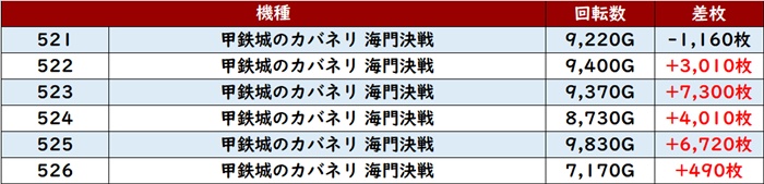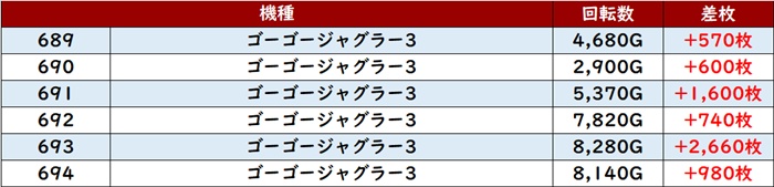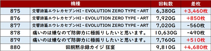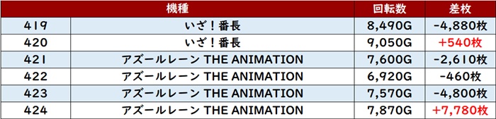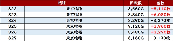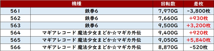 殆どが回転数9,000G超えと盛況で、差枚数+8,030枚を先頭に素晴らしい活躍を見せた!
