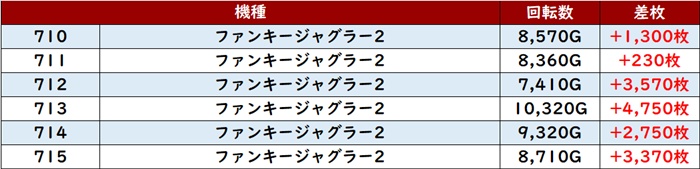 続いて「ファンキー2 710~715」も全台プラス差枚で絶好調!