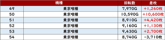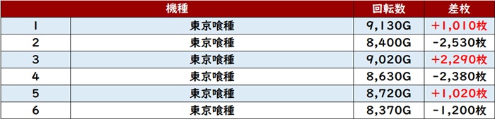 殆どが回転数8,300G超えと圧巻の稼働状況を誇り、差枚数+10,600枚を筆頭に強烈な出玉感を見せていた!