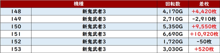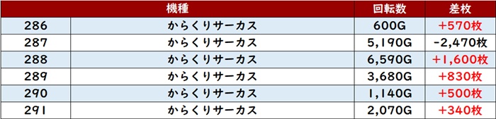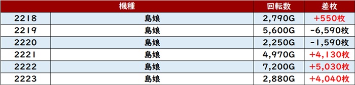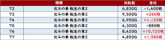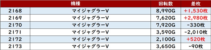 大半が回転数7,100G超えで賑わっており、中には差枚数+11,010枚と素晴らしい出玉感まで見受けられた。