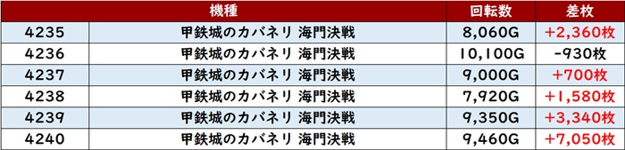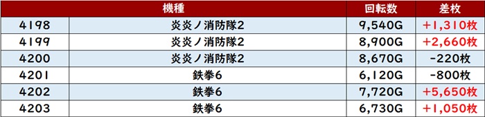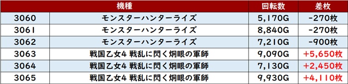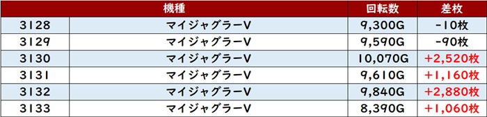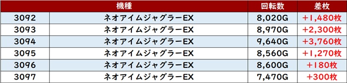 特に「ネオアイム 3092~3097」が、全台回転数7,400G超え且つプラス差枚と好調ぶりをアピールしていた。