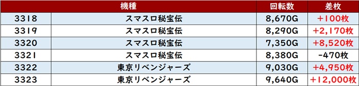 まずは「スマスロ秘宝伝~東京リベンジャーズ 3318~3323」殆どがプラス差枚と絶好調!