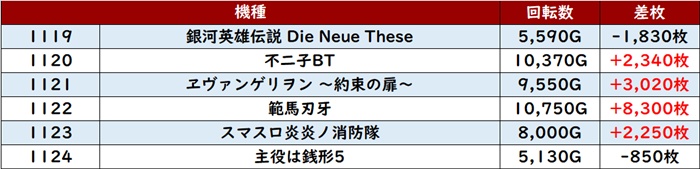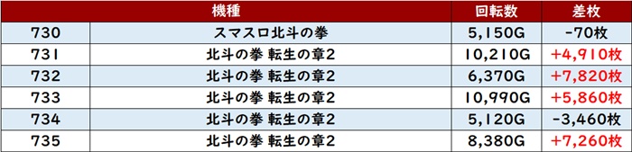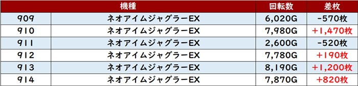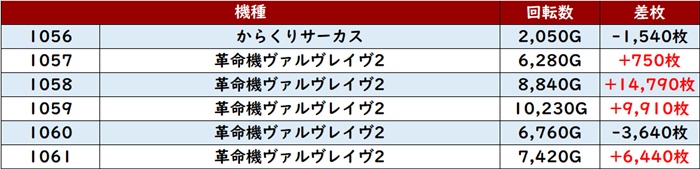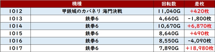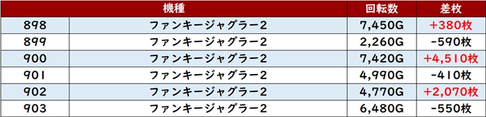 こちらも6台中5台プラス差枚且つ殆どが回転数8,900G超えと優秀な数値の数々を残していた。