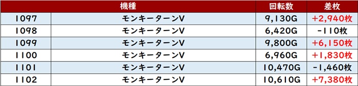 まずは「モンキー5 1097~1102」の半数が回転数9,100G超えと状況が良くなければ成し得ない稼働状況に!
