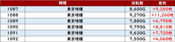 まずは「東京喰種 1087~1092」が全台差枚数+4,000枚超えと群を抜いた盛り上がりに!