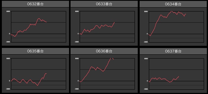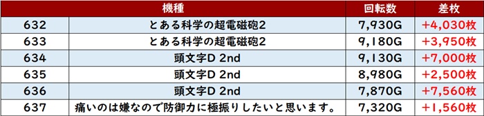 まずは「とある超電磁砲~防振り 632~637」が機種跨ぎで大幅プラス差枚を記録!