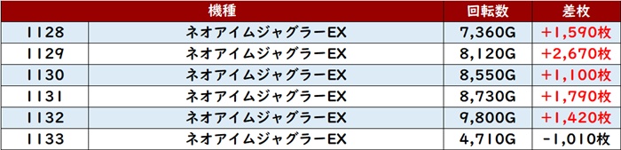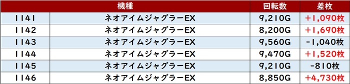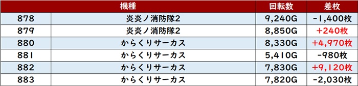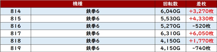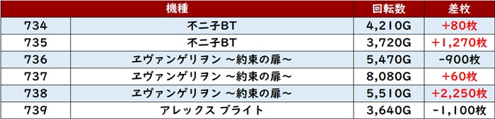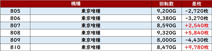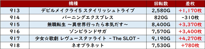全台回転数8,000G以上となっており、中には差枚数+9,780枚の台も確認できメイン機種に相応しい結果となった。