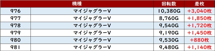 まずは「マイジャグ5 976~981」全台プラス差枚と状況の良さを感じる勝率に!