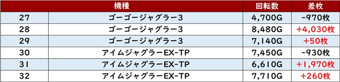 ・集計機種計42台総差枚数:+61,500枚